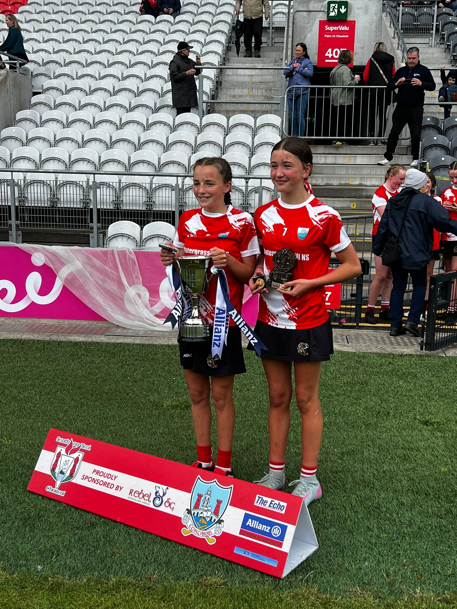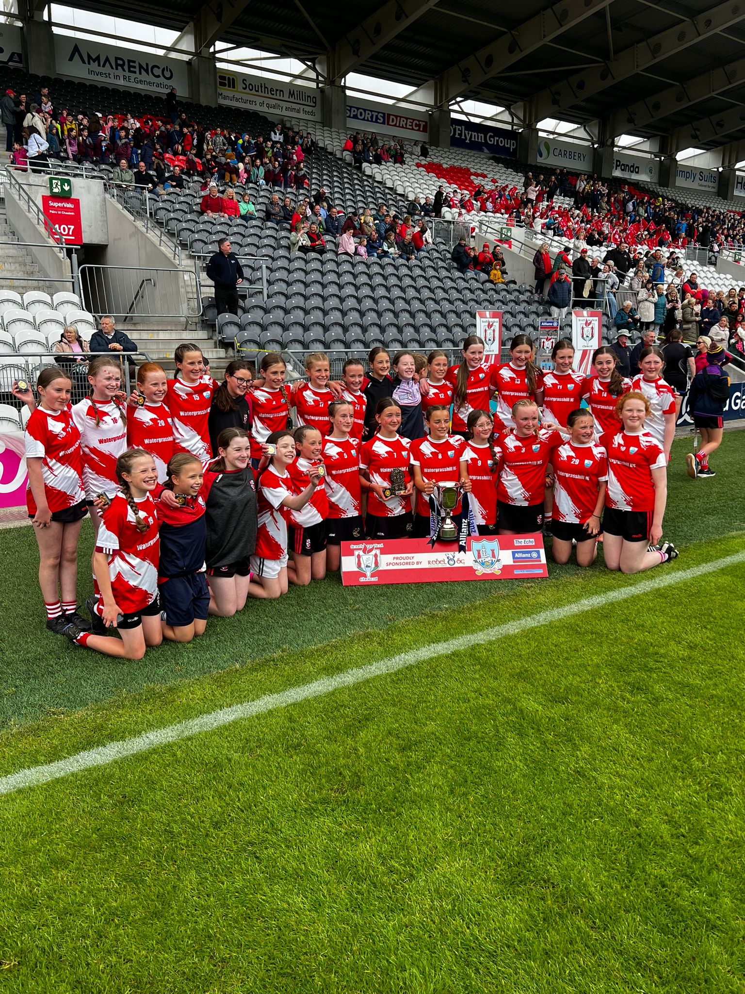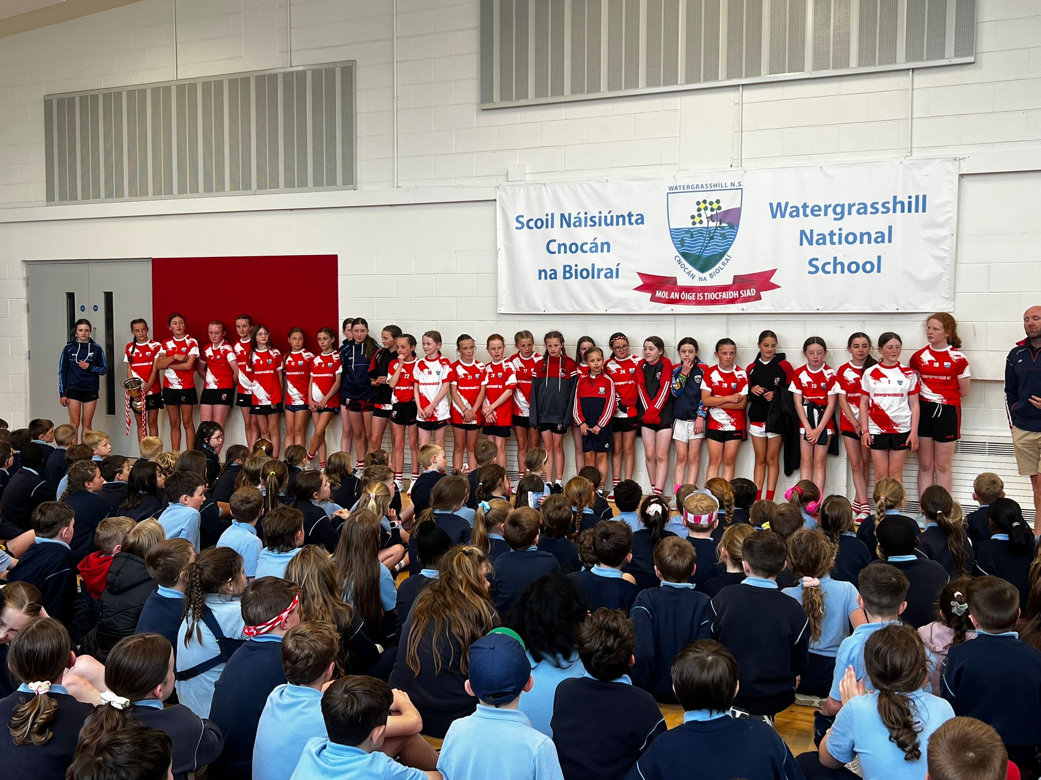 There was great excitement on Monday 26th May when the girls headed off to play in the Sciath na Scol Camogie Final. The whole school lined up to give the girls a guard of honour as they headed off on the bus. The girls played an excellent game and the final score was Watergrasshill 5:08 to Berrings 1:03 which meant Watergrasshill brought the Eamon Ryan Cup back to Watergrasshill NS! We couldn’t be prouder of the girls and their performance! Well done to their coaches and everyone who helped to get them to Páirc Úi Chaoimh.